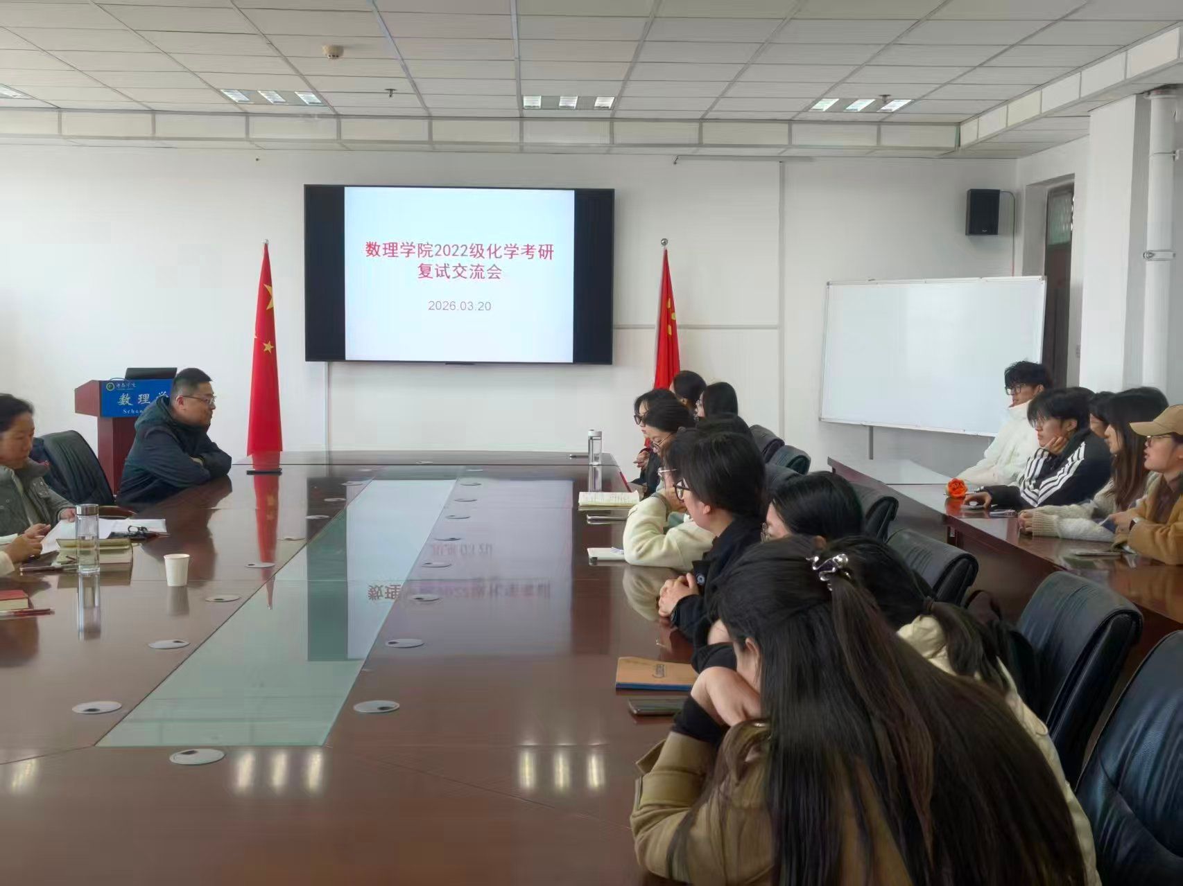 为切实做好2022级考研学生复试与调剂指导工作,帮助同学们精准把握复试节奏、科学规划调剂路径,2026年3月20日下午,数理学院化学系于学院会议室举办考研复试与调剂专题交流活动。化学系全体教师、2022级全体考研学生齐聚一堂,共话研途规划,共解备考困惑。