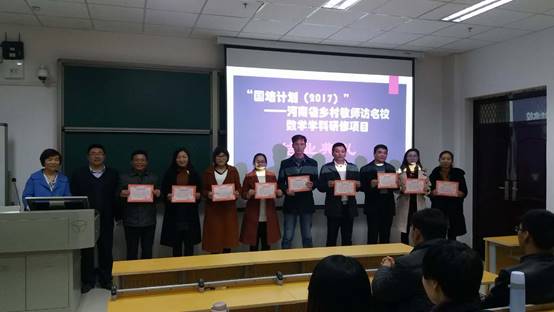 2017年11月24日晚7:00,在E-106教室,数学与统计学院院举行了“国培计划(2017)”乡村教师访名校项目乡村主干学科(数学)培训班结业典礼,数学与统计学院国培项目管理组组长、副院长赵艳敏出席了仪式,本期项目班主任张亚东老师主持了仪式,各个小组的学习导师也参加了典礼。
