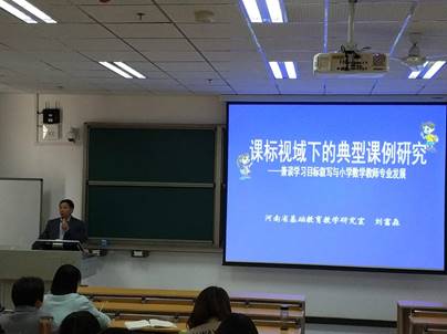 2017年11月24日下午,在E-106教室,河南省基础教育教学研究室小数室主任刘富森老师为我校“国培计划(2017)”乡村教师访名校项目乡村主干学科小学数学的学员们做了一场主题为《课标视域下的典型课例研究》的报告。