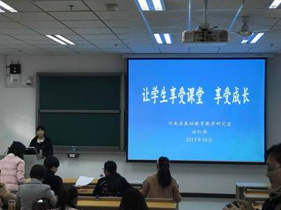2017年11月22日上午,在E-106教室,河南省基础教育教学研究室姚红雁老师应邀为我校“国培计划(2017)”乡村教师访名校项目主干学科(小学数学)的学员们做了一场主题为《让学生享受课堂,享受成长》的报告。