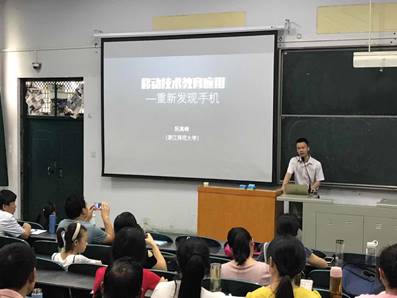 为全面提升国培学员在信息化环境下的学科教育教学能力和专业自主发展能力,真正推动乡村中学教师主动应用信息技术,7月18日上午,在A合十三教室,许昌学院邀请了浙师大阮高峰博士来校作题为《移动技术教育应用—重新发现手机》的专题讲座。“国培计划(2016)”教师培训团队置换脱产研修项目(初中数学)的学员聆听了报告。