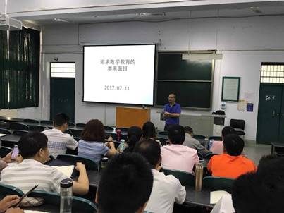 2017年7月11日上午,国培教育专家、郑州市数学教研室教研员冯瑞先老师来到许昌学院,在A合十五教室为我校“国培计划(2016)”教师培训团队置换脱产研修项目(初中数学)的学员做了主题为《追求数学教育的本来面目》的报告。