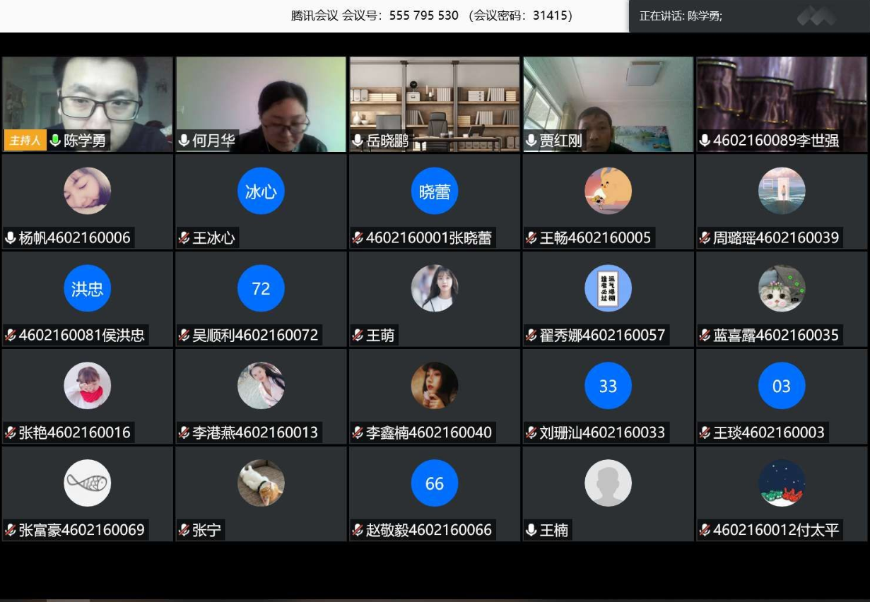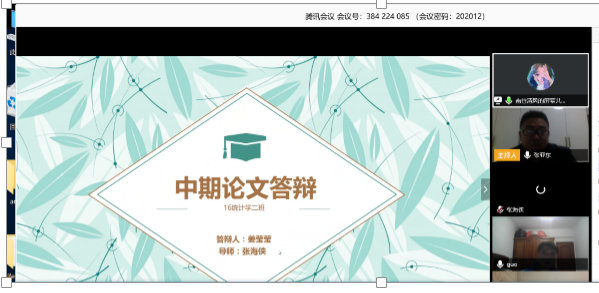 为加强毕业论文过程管理,提高本科毕业论文质量,数学与统计学院定于2020年4月10日-15日进行2020 届本科生毕业论文(设计)中期检查工作。我院2020届本科毕业学生共计164人,其中数学与应用数学专业79人、统计学85人,因受新冠肺炎疫情影响,我校延期开学,本次毕业论文中期检查分8个小组,通过腾讯会议、钉钉、QQ视频通话等形式在线进行。学生通过屏幕分享等方式在线展示开题报告、论文初稿等相关材料,汇报论文进展情况,检查小组成员从论文选题、开题报告撰写、论文结构框架、所采用方法或技术路线等方面提出问题并给出合理化建议和意见。