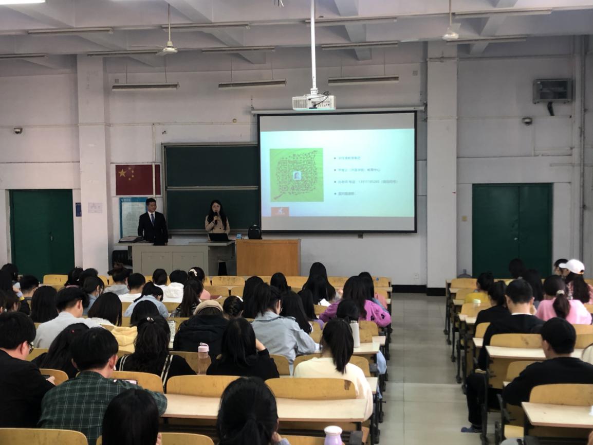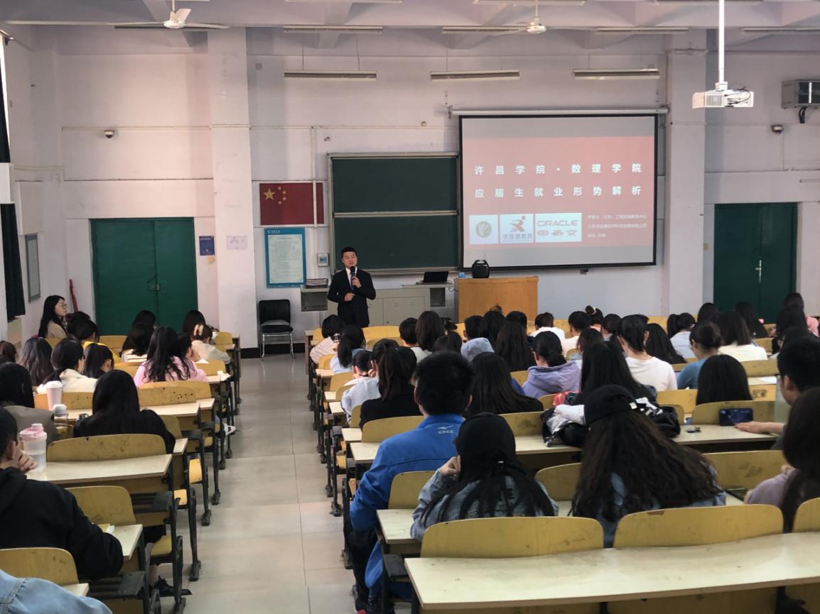 4月19日下午,甲骨文学佳澳的老师们应邀来到我院开展就业形势分析报告会,数理学院辅导员王艳菲和150余名大三学生参加了此次会议。
