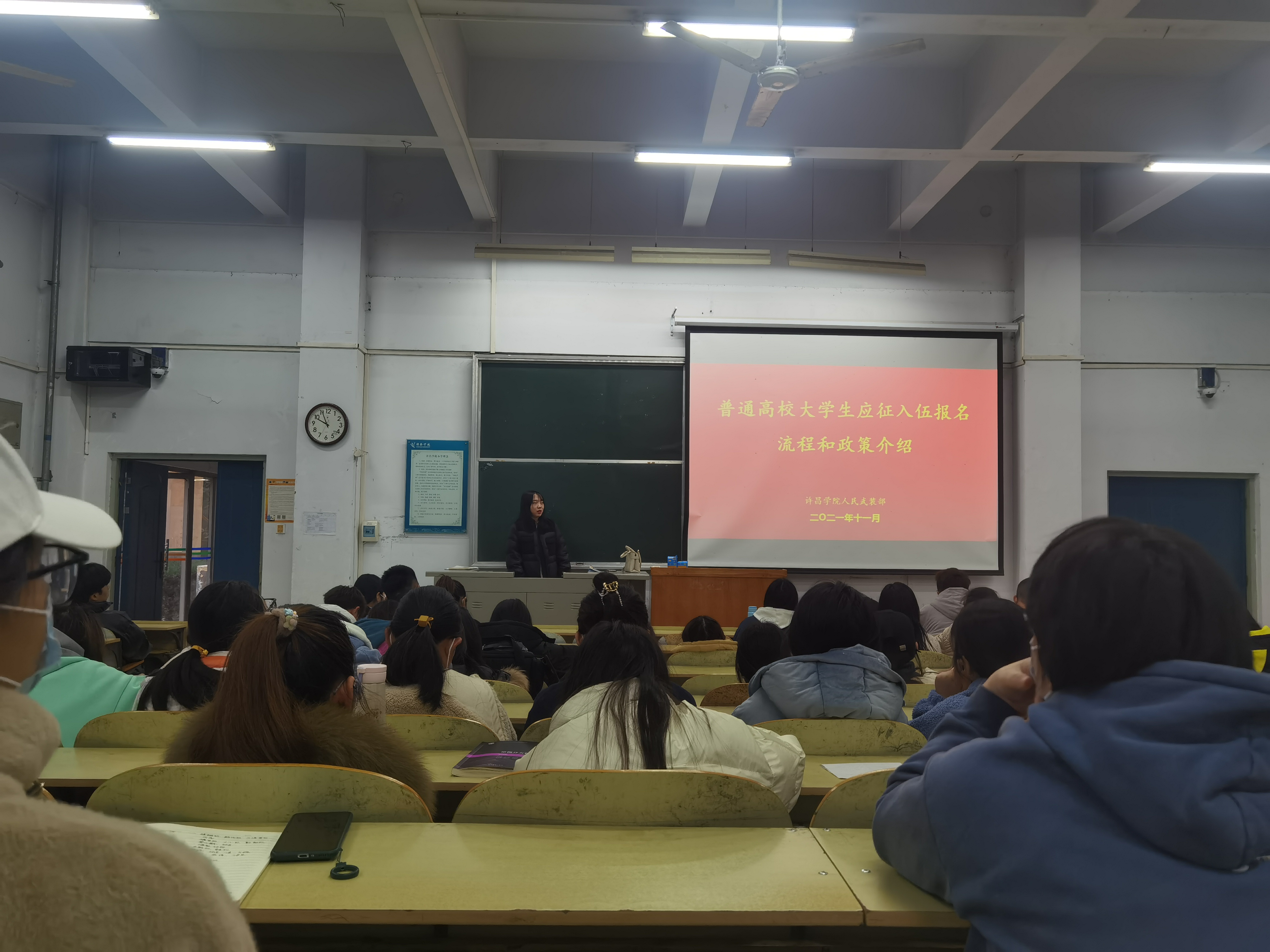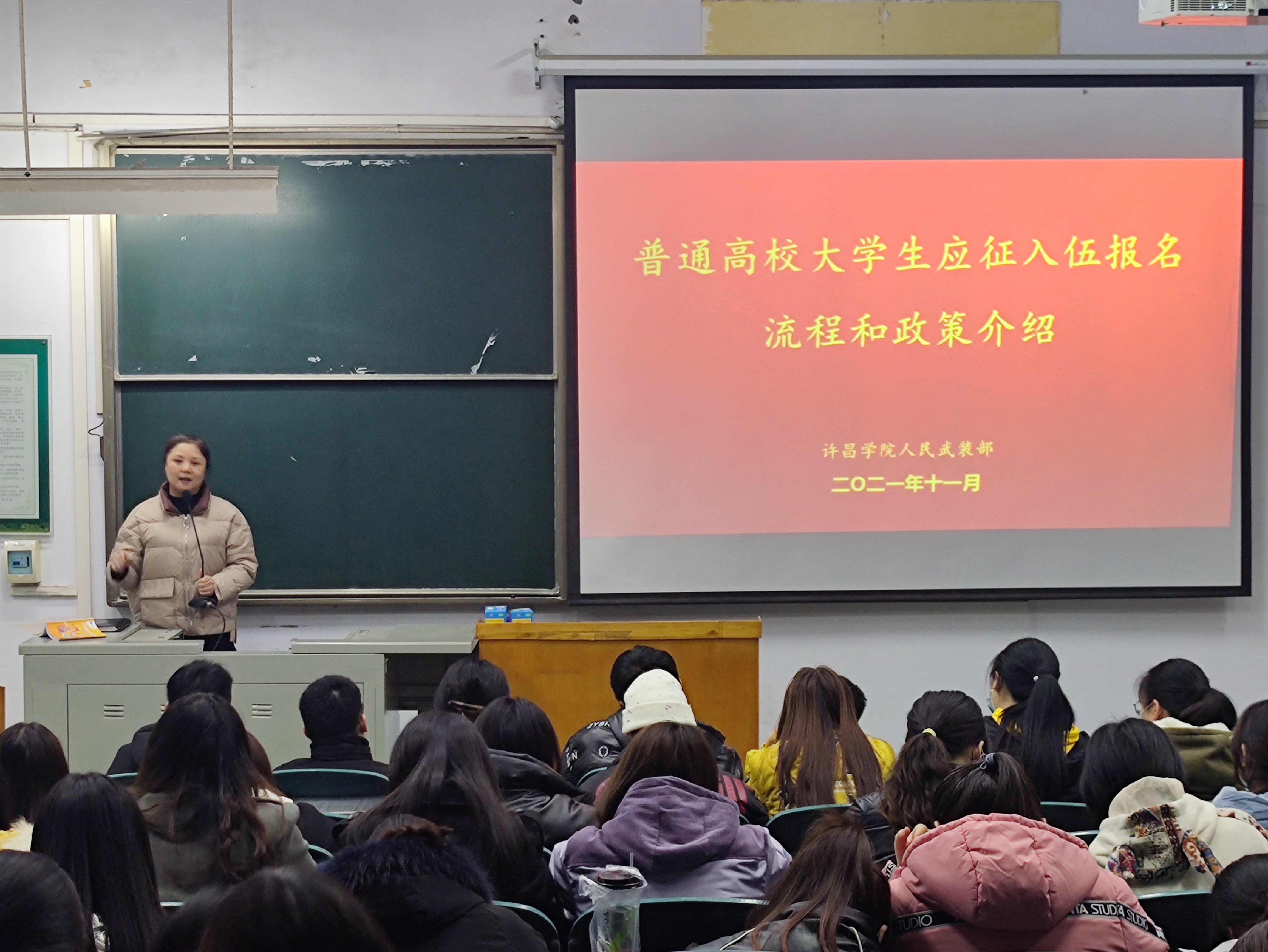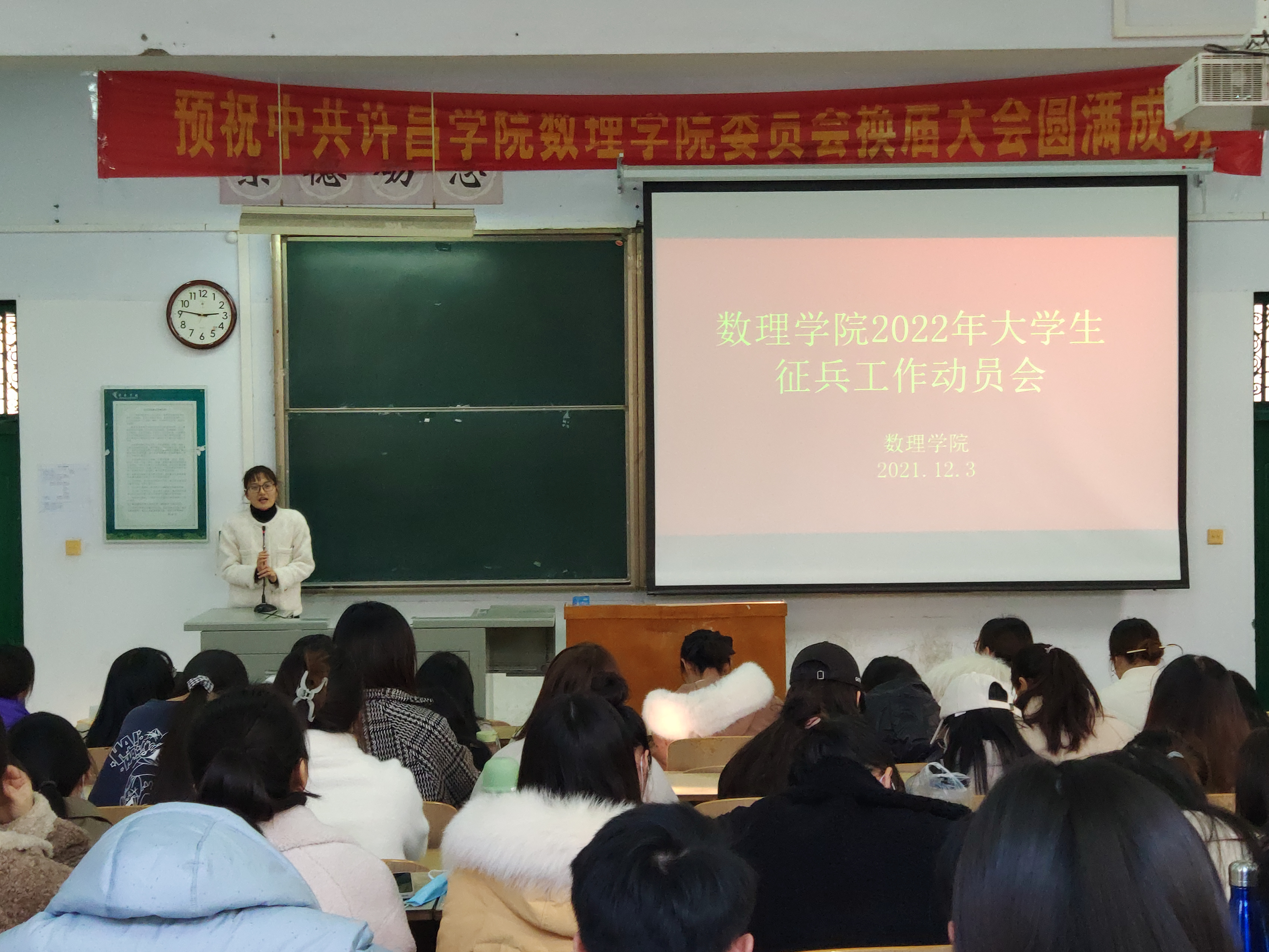 为了加强同学们入伍意识,鼓励学生积极参与应征入伍,提高兵员征集质量推进国防和军队现代化建设。 2021年12月初,数理学院分批次召开2022年大学生征兵动员宣讲会。全体学生和辅导员参加此次活动。