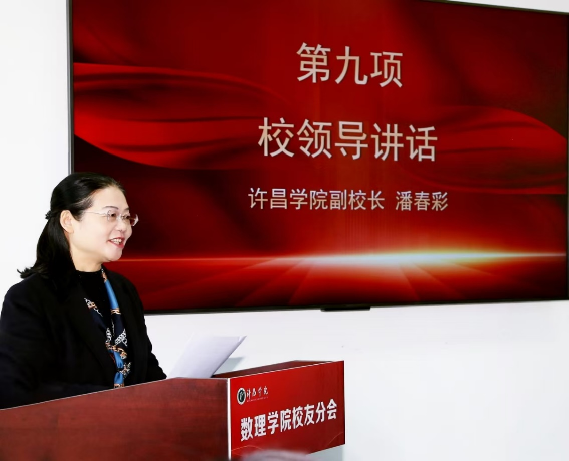 副校长潘春彩教授代表许昌学院致辞。她对各位校友和嘉宾的到来表示热烈欢迎,并系统介绍了近年来学校在人才培养、师资队伍建设、学科建设、科学研究以及社会服务等方面取得的成就。潘校长希望数理学院校友分会能够充当学院与校友之间桥梁,搭建交流合作的平台,充分挖掘和发挥资源优势,助力校友与母校双向赋能,携手并进。