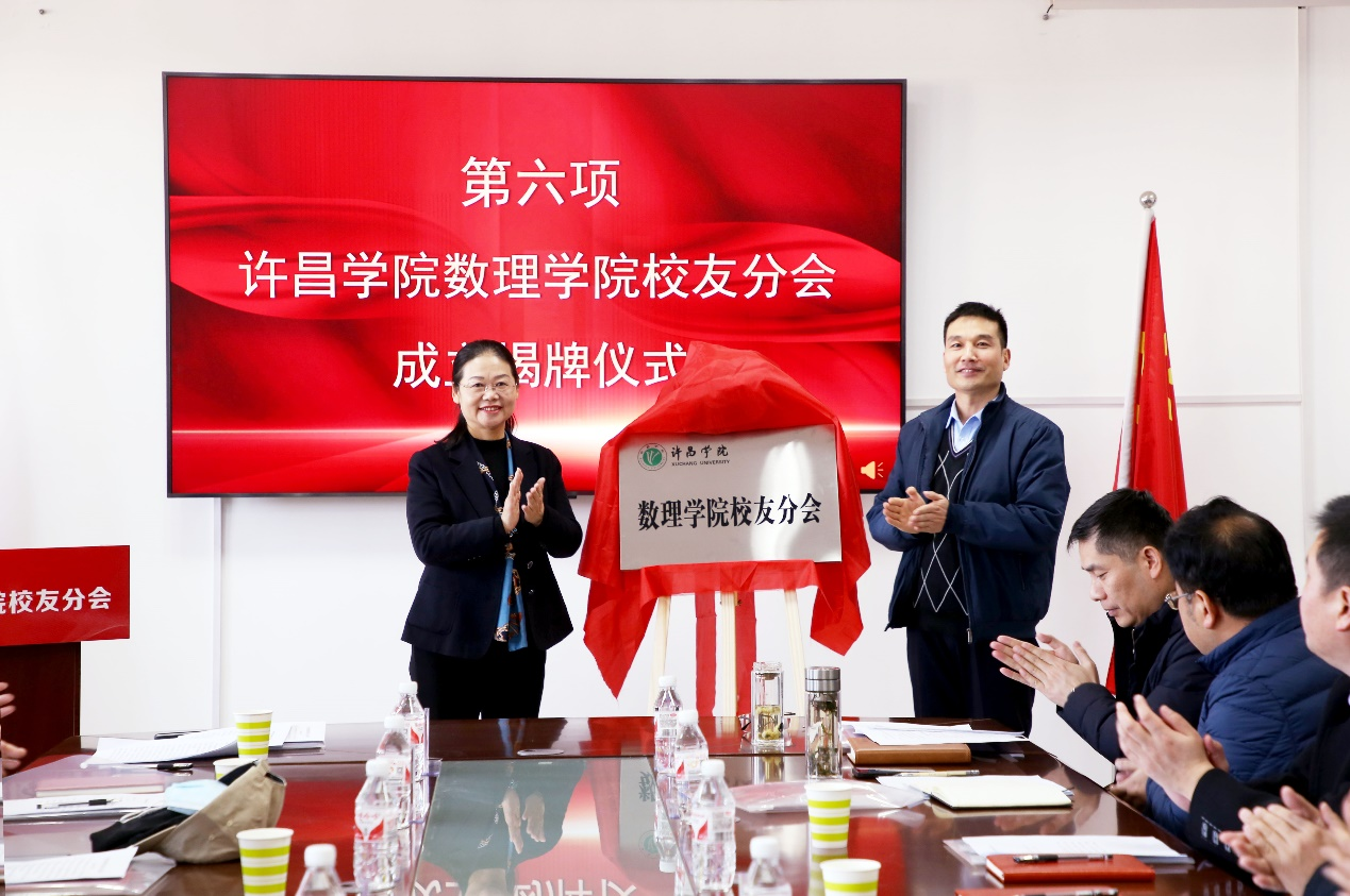 随后,副校长潘春彩教授与学院党委书记苗宝军教授共同为数理学院校友分会成立揭牌。