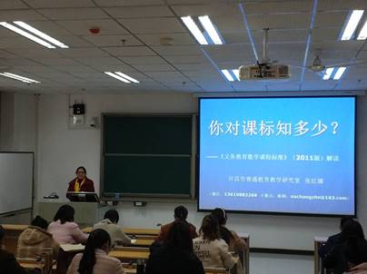 张老师主要从五个方面,将《义务教育数学课程标准》(2011版)与学员们进行了解读。她指出,新课标首先把握数学课程基本性质,强调数学课程本质,其次要求理解数学“四基”基本内涵,拓展数学课程目标。第三树立数学教学新“教学观”,正确处理“教”、“学”关系。第四注重数学“核心概念”把握,培养基本数学素养。第五注重学生“两种能力”培养,发展学生数学思维。她还说,其实,《新标准》和《实验稿》的精神是一致的,在关注变化的同时, 我们要关注什么是没有变化的,实际上就是对于数学教育价值的深刻认识和对于学生发展的真正关怀。