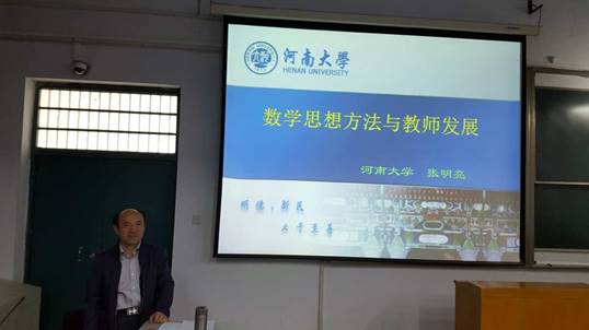 2017年11月21日上午,在B2-301教室,河南大学张明亮教授为我校“国培计划(2017)”乡村教师访名校项目主干学科(初中数学)的学员们做了主题为 《数学思想方法与教师发现》的报告。