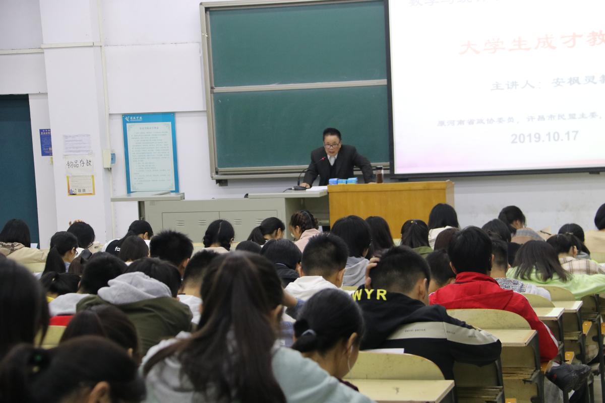 2019年10月17日晚上七点,数学与统计学院在B合五教室准时召开了以“大学生成才教育”为主题的专题讲座。此次活动邀请原数学系主任安枫灵教授作为主讲人,旨在让数学与统计学院新生明白两个问题:“什么是成才?“如何才能成才?”
