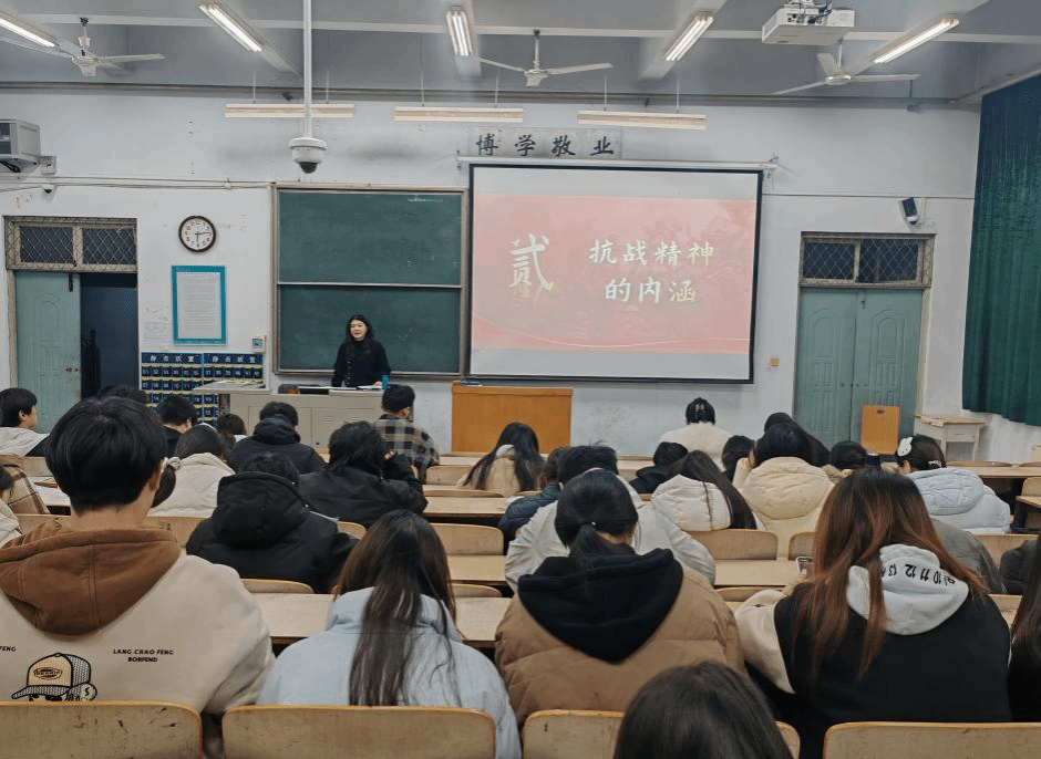 课上,萧彤老师以“传承伟大抗战精神 凝聚青春挺膺担当”为主题,从抗战精神的形成、抗战精神的内涵、抗战精神的价值探寻、抗战精神的传承路径四个方面展开讲解,全面介绍了在伟大抗战精神的指引下,我国从苦难走向复兴的奋斗历程。通过回顾历史脉络的方式,带领同学们感受抗战精神中“天下兴亡、匹夫有责”的爱国情怀与“视死如归、宁死不屈”的民族气节,体会到抗战精神是砥砺复兴的宝贵财富。最后,结合青年责任的实例详细阐述了传承抗战精神对当代青年挺膺担当的重要意义。