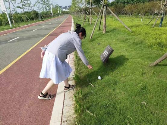 首先,她与小组成员共同制作垃圾分类问卷调查,并在线上社交平台和线下同时邀人填写。接着,她们走进社区捡拾路上被随意丢弃的垃圾并扔进分类垃圾桶中。