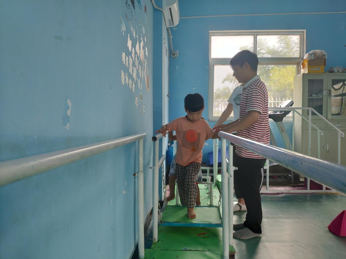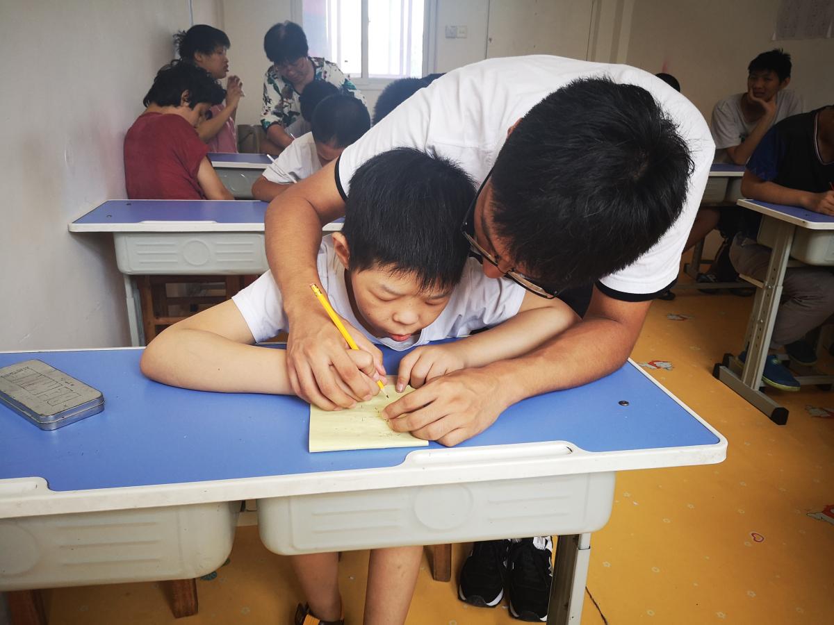 他们在八点左右就到达了蓝天康复中心,今天还是选了三个队员来带脑瘫班的孩子。脑瘫班的孩子们在他们的认真努力的教导下,走路和爬行都越来越顺畅了,这是他们的成果,看着快乐的孩子队员们也由衷的感到开心与自豪。另外,还选了三个队员协助老师带班,剩下的队员们都去了中班教中班的孩子们写汉字的笔画,老师将孩子们一一分配给他们后,便在小黑板上教了一遍笔画的写法,但是孩子们很难集中注意力,这就需要他们多多吸引他们的注意力到黑板上。老师教完后,就到队员们教孩子们写了。他们首先抓住孩子们容易乱动的手,之后,将孩子的左手压住本子,右手握好笔。孩子们也认真地学着,好几个孩子非常的厉害,全程自己写下来。