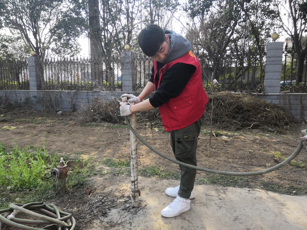 志愿者们简单讨论后分为两组展开活动,其中一组一部分的人将教室、走廊和孩子们的宿舍都打扫了一遍,而其他人把窗户、桌椅和孩子们的运动器材都擦干净了。与此同时另一组志愿者们在院子中进行他们的除草活动。听似简单的任务,却需要志愿者们极大的耐心。志愿者们分为男女两队,男生负责锄地和浇菜,女生负责种花和打杂。头顶骄阳,不一会儿志愿者们便满头大汗。志愿者们希望这次活动不仅是给他们的生活环境提供了帮助,而且还希望能给孩子们的精神和心灵上带来帮助。时间在志愿者们的劳动中悄悄溜走,志愿者也到了该离开的时候。