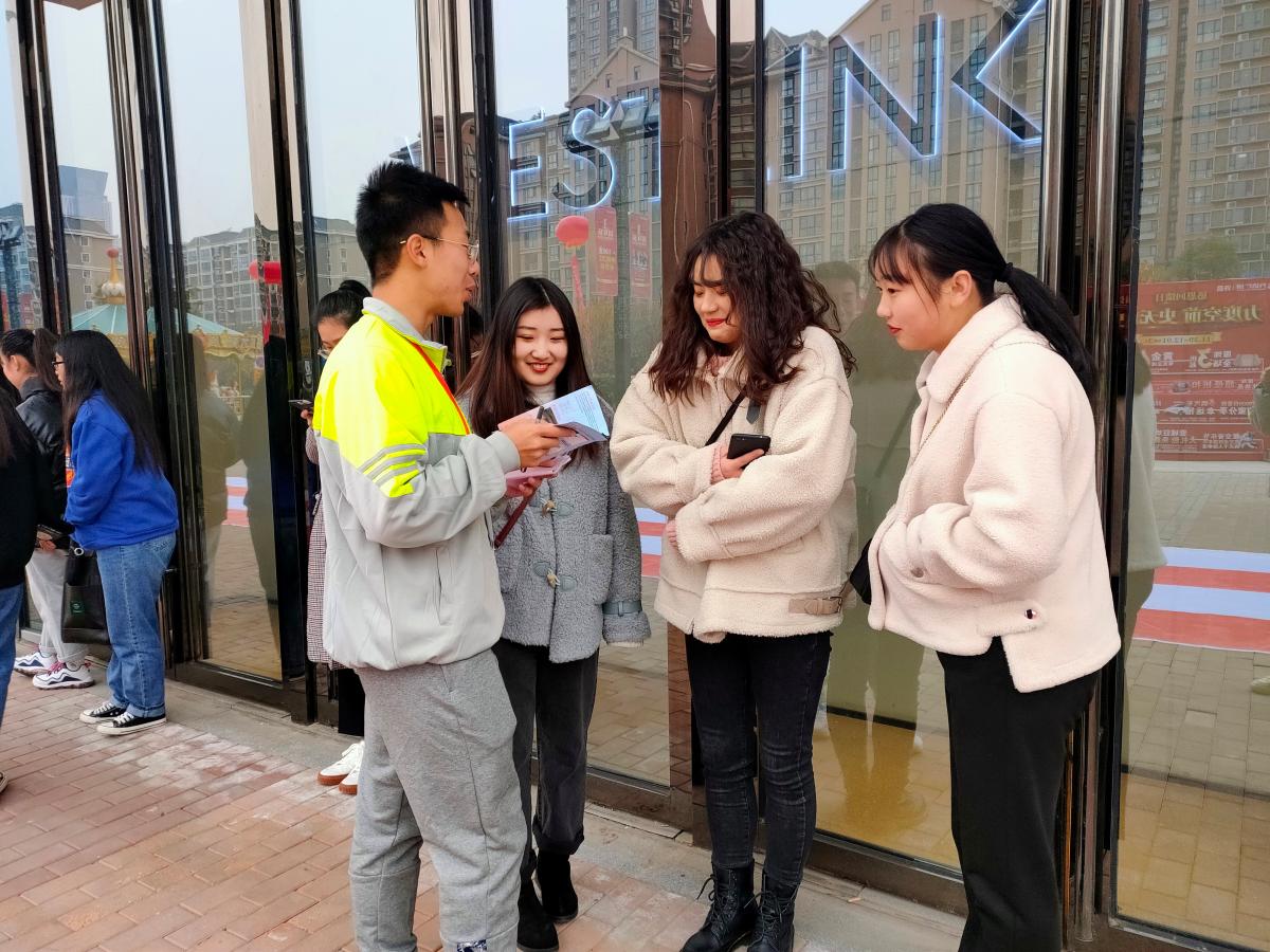 2019年11月30日下午,许昌学院数学与统计学院青年志愿者在负责人的带领下前往万达广场为贫困地区的孩子们进行劝募。虽然天气很冷,但阻挡不了他们想要为孩子们带去温暖的炽热的心。志愿者们按时在国旗台前集合,然后乘坐公交车前往劝募地点。