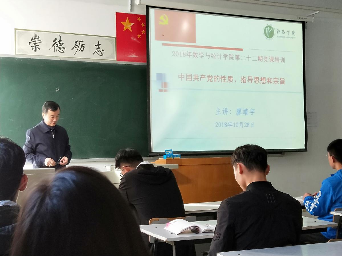 为了让入党积极分子了解党的先锋队性质,进一步加深对党的指导思想的认识,2018年10月28日上午九点,数学与统计学院在B3-206教室开展了有关党的性质、宗旨和指导思想的党课。主讲人为廖靖宇教授。