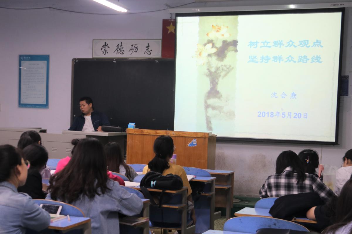 为了加强数学与统计学院党课培训班学员对党的认识,促进培训班同学间的思想交流,引导其树立崇高的共产主义理想信念。2018年5月20晚上七点整,数学与统计学院组织第21期党校学习培训班的同学们在学院楼B-302教室开展了《坚持群众观点,践行群众路线》专题教育活动,此次培训课由沈会焘老师负责。