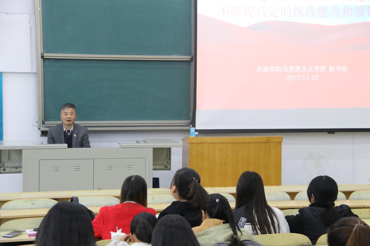 为了促使同学们更好地学习、领会和把握党的十九大的精神实质和丰富内涵,2017年11月11日上午八点半,数学与统计学院分团校于B合五教室组织开展了标题为《高举习近平新时代中国特色社会主义思想旗帜,接力奋斗,投身新征程》的理论培训课程。此次党课由赵书田老师担任主讲人。数学与统计学院200余人参加了此次培训课。