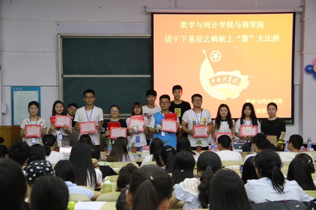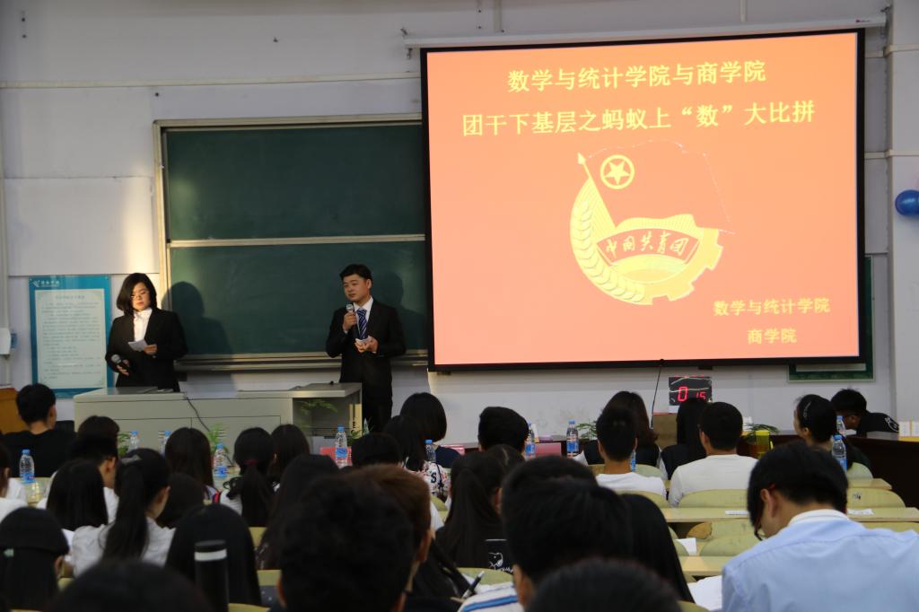 为进一步加强许昌学院共青团组织建设和干部队伍建设,提升共青团组织的凝聚力,根据校团委“团干部下沉基层”工作机制,2017年5月18日下午6点半,数学与统计学院和商学院共同参与了由黑蚂蚁数据社团举办的“蚂蚁上“数”大比拼”知识竞赛,数学与统计学院团总支副书记余璐、大数据学院副院长潘庆、数学与统计学院学生会主席李佳琪及其他主席团成员、商学院学生会主席翟志斌及其他主席团成员出席活动,两个学院16级各班团支部参加了活动。