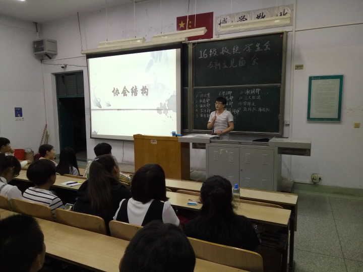 学生会会长刘家林首先进行自我介绍,随后对学生会进行简单的介绍,希望16级新生们待会认真听各部门部长对部门工作的介绍,以后可以竞选自己感兴趣和适合自己的部门,进而来锻炼自己,丰富自己的大学生活。学生会副会长任文秀、田海龙、刘墉和团总支副书记张盈斐依次进行工作职能介绍。学生会各个部门的部长用PPT生动地展示了他们所在部门的工作职能、以往的工作成果以及部门成员的联系方式,给想要更好的了解部门的新生提供便利,最后鼓舞16级新生积极加入学生会,在其中历练自己,完善自己。