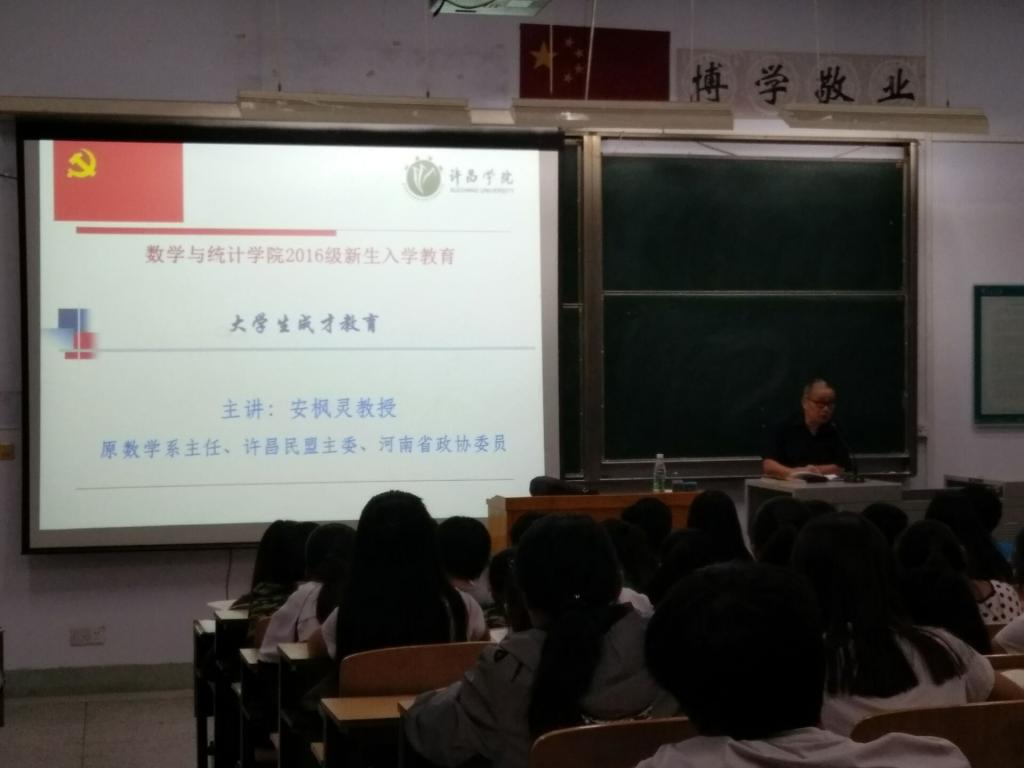 2016年9月19日晚上七点半,数学与统计学院于B合十四开展关于“大学生成才教育”专题讲座,主讲嘉宾为数学与统计学院退休教授安枫灵教授,同时参加本次讲座的有团总支副书记兼16级辅导员余璐老师以及16级全体新生。
