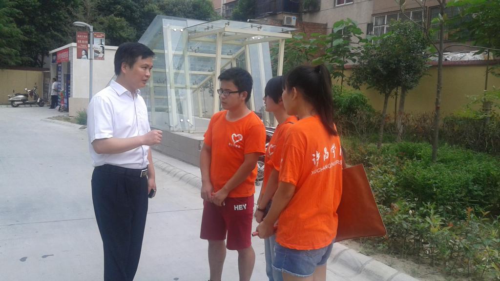 2015年7月11日上午,共青团许昌学院团委书记张鹏辉在团委杨乐老师和数学与统计学院团总支书记沈会焘老师的陪同下,前往莲韵雅苑小区看望了数学与统计学院参加2015年大学生暑期社会实践创新创业拓展项目的队员。