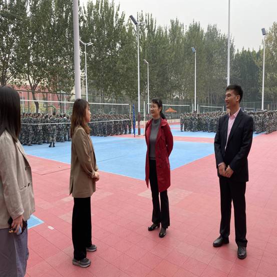 在学生军训过程中,数理学院党委书记牛裕琪、副书记苗宝军以及团委书记余璐到军训现场为新生加油鼓劲,看到学生们虽然辛苦,但是又努力配合、坚持到底,甚感欣慰