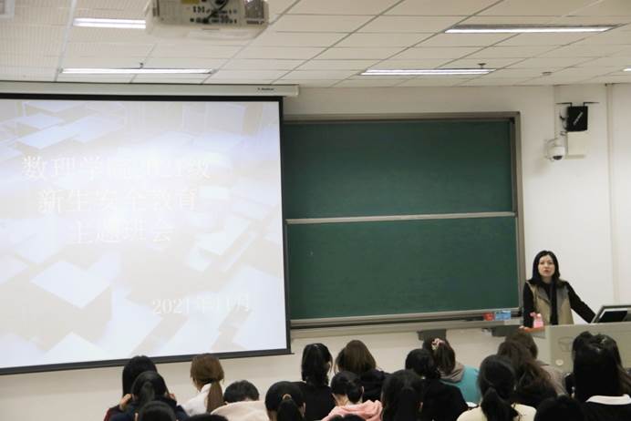 为加强同学们安全防范意识,提高同学们的安全防范能力。2021年11月4日晚上七点,数理学院在E-109教室展开了2021级新生安全教育主题班会。此次班会由2021级辅导员余璐老师主持,全体2021级新生参加此次班会。