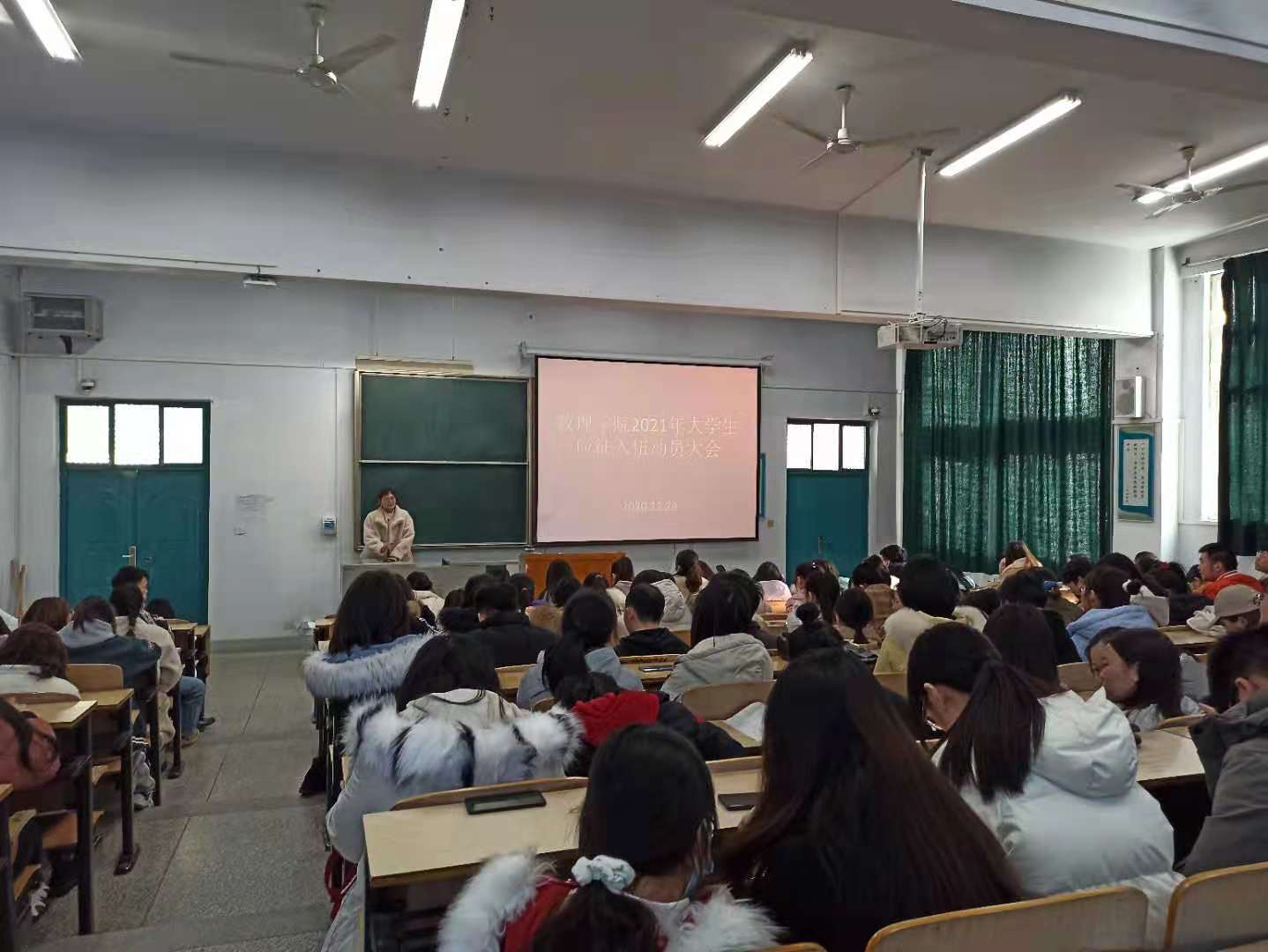 为了扎实做好我校2021年大学生应征入伍工作,充分激发广大学生参军入伍热情,鼓励大学生积极参与应征入伍,提高兵员入伍质量,推进国防和军事现代化建设,12月24日下午,许昌学院数理学院杜娟、李琼阳、王艳菲、仝婧老师分别在B合十九、B合十七对2017级、2018级、2019级、2020级学生进行了大学生征兵动员大会。
