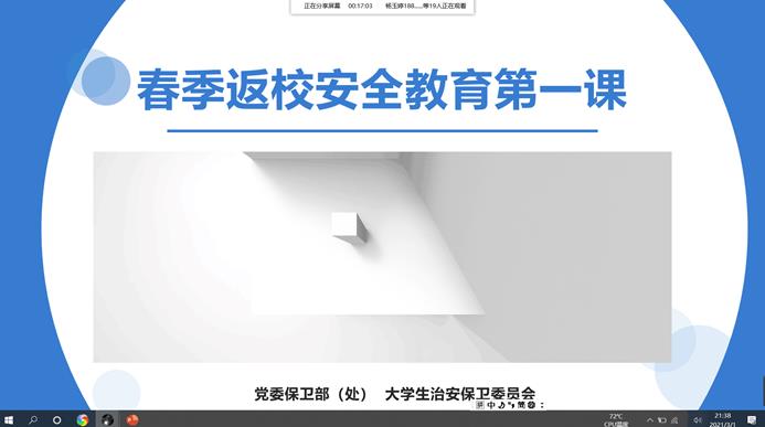 为了提高学生的安全防范意识,数理学院于2021年3月1日开展大学生春季返校安全教育第一课,数理学院辅导员通过线上、线下的方式,分年级举行了主题班会。