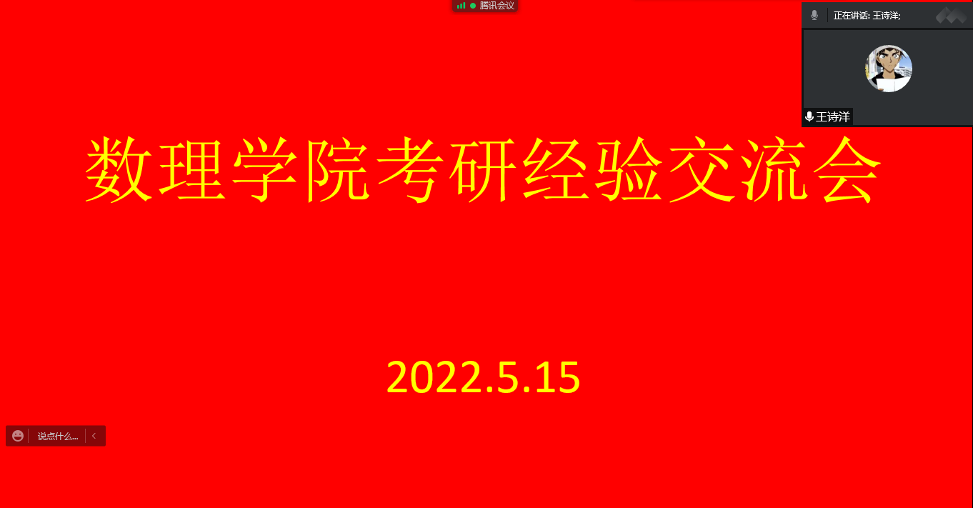 为使同学们更好的了解考研信息,把握未来考研的趋势,掌握相关考研技巧,2022年5月15日上午9时,我院举办了线上考研经验交流会。本次考研经验交流会由院团委学生会举办,郭延涛副院长及考取硕士研究生的2022届优秀毕业生应邀参加了此次交流会。