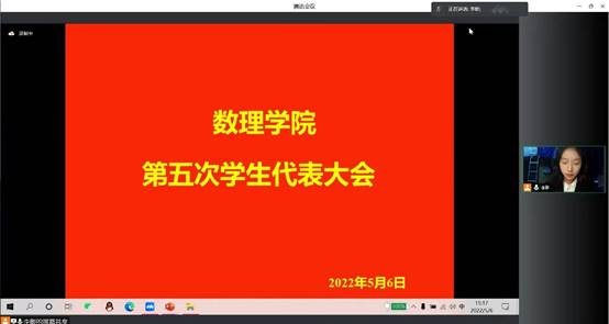2022年5月6日14:30,数理学院第五次学生代表大会正式开始。我院学生会代表李影主持会议并宣布第五次学生代表大会开幕,全体参会成员共唱《义勇军进行曲》。