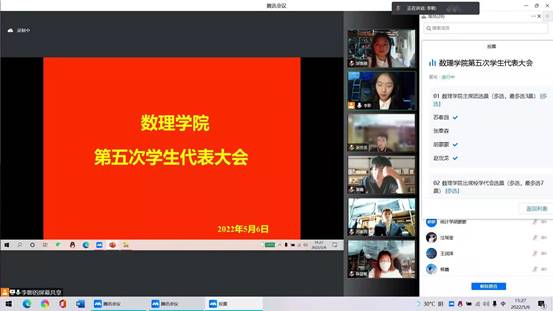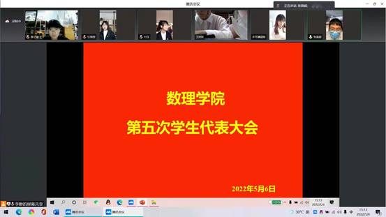 2022年5月6日下午14:30,数理学院第五次学生代表大会在线上顺利召开。数理学院党委书记牛裕琪、团委负责人仝婧、校学生会青年发展部负责人张震超等出席了本次会议,学生会代表李影担任此次会议的主持人。