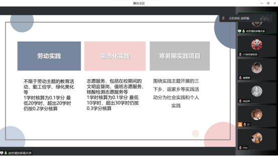 2022年10月16日晚七点,数理学院在线上召开了以“第二课堂”为主题的专题讲座。此次讲座由数理学院团委书记余璐组织,数理学院学生会青年发展部干事赵若瑾主讲,全体22级新生参与了此次入学教育。