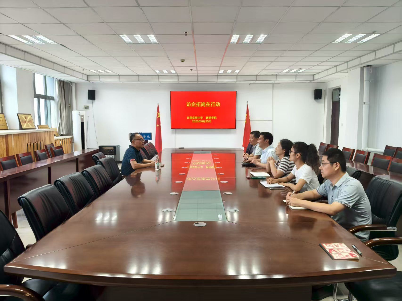 为深入贯彻落实教育部关于 “访企拓岗促就业” 专项行动的工作要求,持续拓宽毕业生就业渠道,8 月 25 日,数理学院特邀许昌实验中学副校长王晨旭莅临学院开展交流座谈。数理学院党委书记苗宝军、副书记孔琪、副院长郭延涛、化学系主任王磊及辅导员参加座谈。