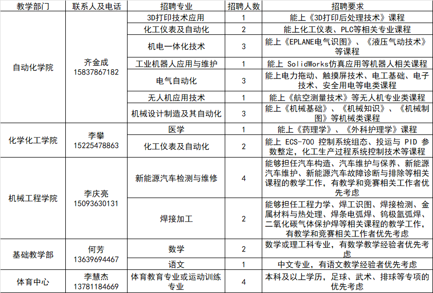 学校多年来建设了一支数量充足、师德高尚、专业结构合理、综合素质优良的专兼职教师队伍。现有在职教职员工375人,其中博士2人,硕士101人,大学本科255人,正高级职称10人,副高级职称53人,中级职称76人。现有国务院政府特殊津贴专家3人,全国技术能手5人,全国石油和化工职工教育教学名师9人,全国石油和化工行业优秀技能人才18人,国家级、省级技能大师工作室7个。