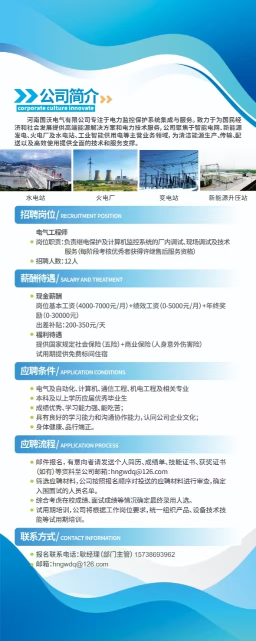 【岗位介绍】电气工程师 负责继电保护及计算机监控系统的厂内调试、现场调试及技术