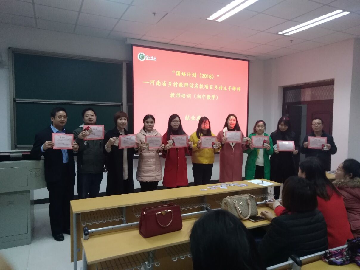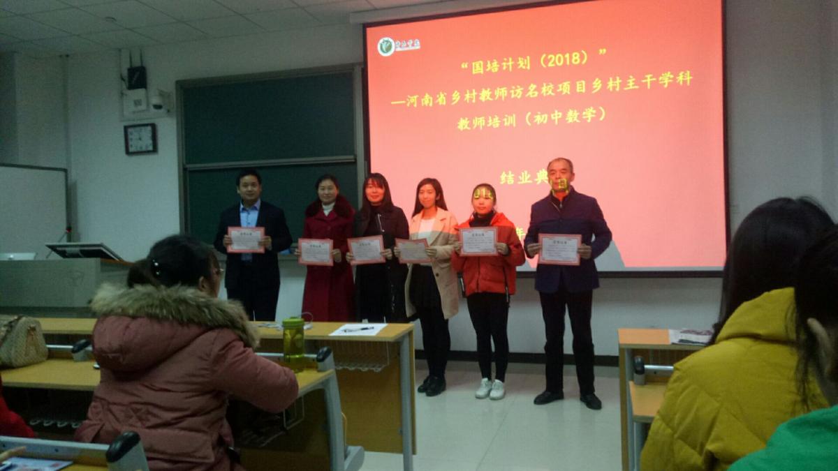 2018年12月1日上午,在文科综合楼E-106教室,数学与统计学院举行了“国培计划(2018)”乡村教师访名校项目初中数学学科培训班结业典礼,应邀出席结业典礼的有数学与统计学院党总支书记牛裕琪,各个小组的学习导师,本次仪式由张亚东老师主持。