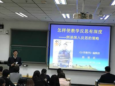 2017年11月15日下午,在E-106教室,河南教育报刊社《小学教学》编辑部副主任、杂志副主编殷现宾老师为我校“国培计划(2017)”乡村教师访名校项目(小学数学)的学员们做了主题为《怎样使教学反思有深度—例谈深入反思的策略》的培训。