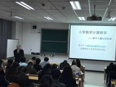 2017年11月15日上午,在E-106教室,首都师范大学初等教育学院硕士生导师曾小平老师为我校“国培计划(2017)”乡村教师访名校项目(小学数学)的学员们做了主题为《计算数学的设计与思考—基于儿童认知发展》的培训。