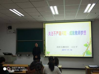 2017年11月14日上午,洛阳机车学校高级教师、党支部书记王江平老师,在E-106教室,为我校“国培计划(2017)”乡村教师访名校项目(小学数学)的学员们做了主题为《关注不严谨问题,成就教师梦想》的报告。