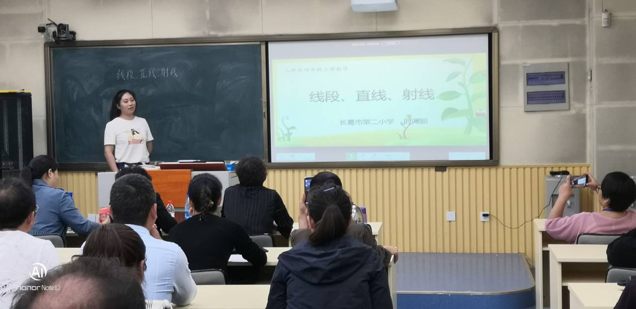 接着,时老师的赛课内容是《线段、直线和射线》,时老师在教学中引导学生观察、分析、讨论,让学生在交流中不仅锻炼了用数学语言表达能力,而且也促进了数学思维的发展。