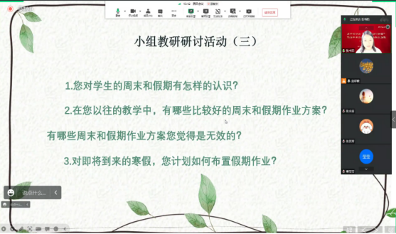 接下来,小组成员每个人就寒假作业设计和本校作业现状说了一下自己的感想,每个地方对作业的设计都有自身不同特点且非常用心,对作业的落实和反馈也要求非常严格。