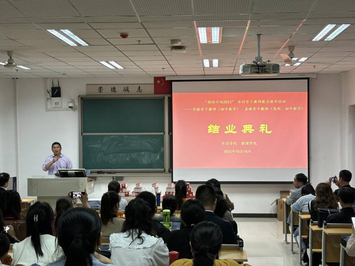 2023年10月16日晚,许昌学院“国培计划2023”农村骨干教师能力提升培训—市级骨干教师培训(初中数学)班学员在许昌学院国培教室举行了隆重的结业典礼。
