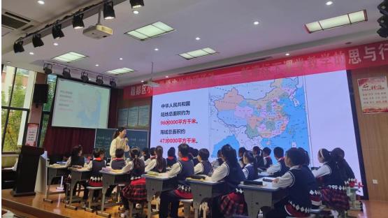 接着,由南关村小学的贾亦嫄老师展示课例《公顷和平方千米》。学生通过课前学习单回顾旧知,贾老师顺势提出让学生用1平方米量一量学校占地面积。学校卫星平面图的展示让学生直观感知操场边长100米,这样的正方形就是1公顷,学生利用1公顷的表象估计学校、许都广场、时代广场等建筑占地面积。