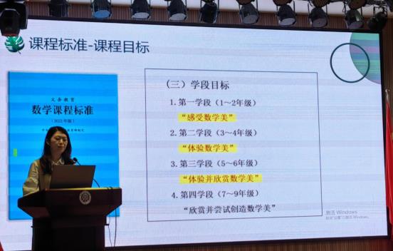 首先,由贾亦嫄老师为我们做的基于“数学美”的小学数学教学实践研究课题的开题报告。贾老师从课题的提出、教育现状、核心概念界定、研究目标、研究内容及研究的思路这几个方面进行叙述。