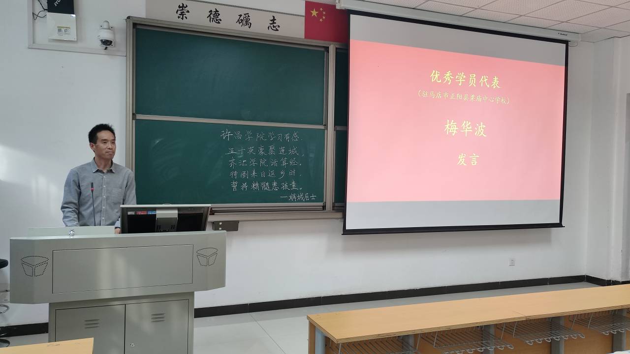 随后,来自驻马店市正阳县梁庙中心学校梅华波老师作为优秀学员代表发言,表示非常感谢许昌学院提供了此次培训学习的机会,通过这十天的培训,受益匪浅,感慨颇多,感谢许昌学院,感谢同行的老师们!