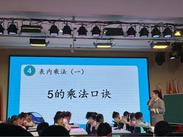 首先,许州路小学贾苗苗老师执教的二年级数学《5的乘法口诀》,展示情景图,引发学生思考并提出问题。在一步步的活动中带领学生总结出5的乘法口诀。整个课堂教学无不体现一切从学生的实际出发,为了孩子更好的对知识进行更好地掌握的出发点来组织课堂教学,整堂课学生在轻松愉悦的气氛中求得知识的同时,也获取了如何学习的方法与能力,使情感得到了升华。