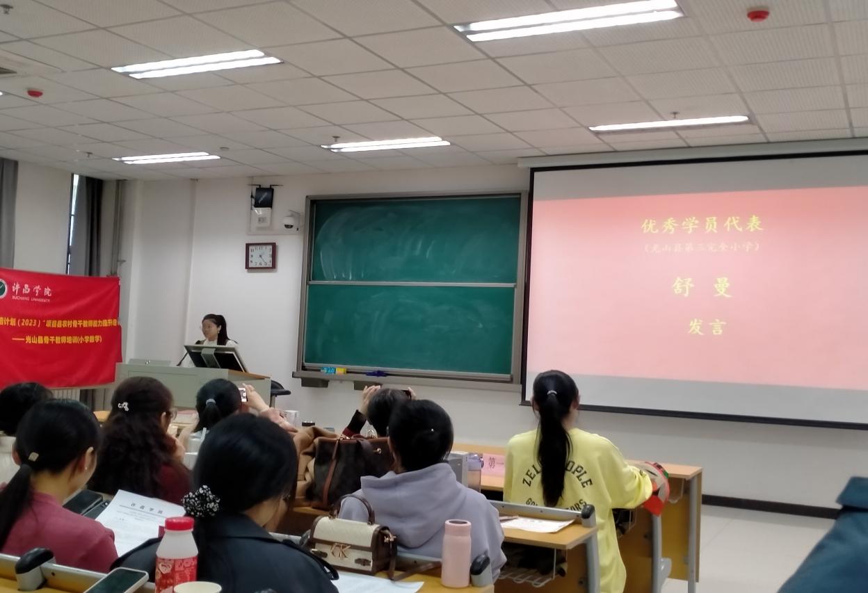 随后,来自光山县第三完全小学的舒曼老师作为优秀学员代表发言,表示非常感谢许昌学院提供了此次培训学习的机会,通过这十五天的培训,受益匪浅,感慨颇多,感谢同行的老师们!