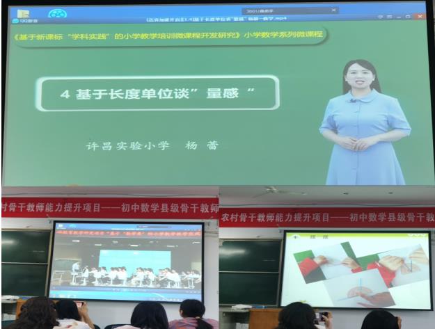 活动开始,学员老师被分成两个班进行教研活动。一、二组学员老师在许昌市文峰路小学副校长,中原名家张红娜名师工作室成员,中小学高级教师高利芳老师带领进行小组教研活动。高老师先带领大家一起观看了杨老师上的《认识毫米》的微课和贾老师《公顷和平方千米》的实录课。高老师借助课例分析、解读了度量应多让学生参与和体验,培养学生量感的重要性,并总结了培养量感的方法,应多从学生身边的实例和生活找素材,多让学生从生活中感悟数学。紧接着,小组内三位教师上台分享了自己的微课:《认识厘米》《用数对确定位置》《整数乘除法的整理和复习》。接着高老师给三位老师做了精彩点评,并给大家介绍了许多实用的教学资源和教学手段,且讲解了微课和教学中应注意哪些事项,介绍了教学中非常实用的教学方法。听了高老师的教学理念、课例分析、实用得的教学方法,大家有种“柳暗花明又一村”的感觉。
